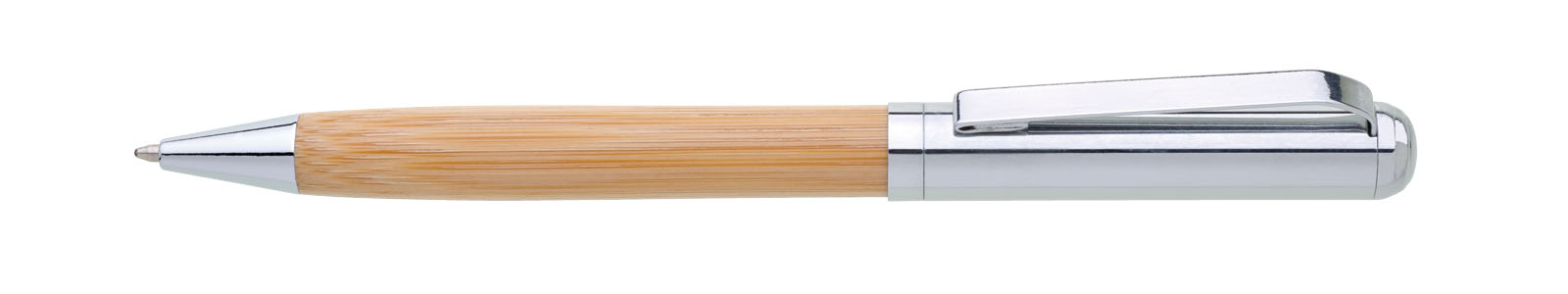 Otočná kovová propiska s bambusovou úchopovou částí. Součástí výrobku je papírová krabička.